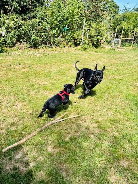 Peat ist nicht territorial, deshalb ist es normalerweise kein Problem, wenn andere Hunde das Grundstück betreten. Sollten sich allerdings bereits andere Hunde auf dem Grundstück befinden, kommt bitte nicht einfach direkt herein. Durch die Gruppendynamik kann es schon mal passieren, dass gebellt wird, wenn plötzlich ein „Fremder“ mitten in die Runde platzt – frei nach dem Motto: „Moment mal, wer bist du denn?“